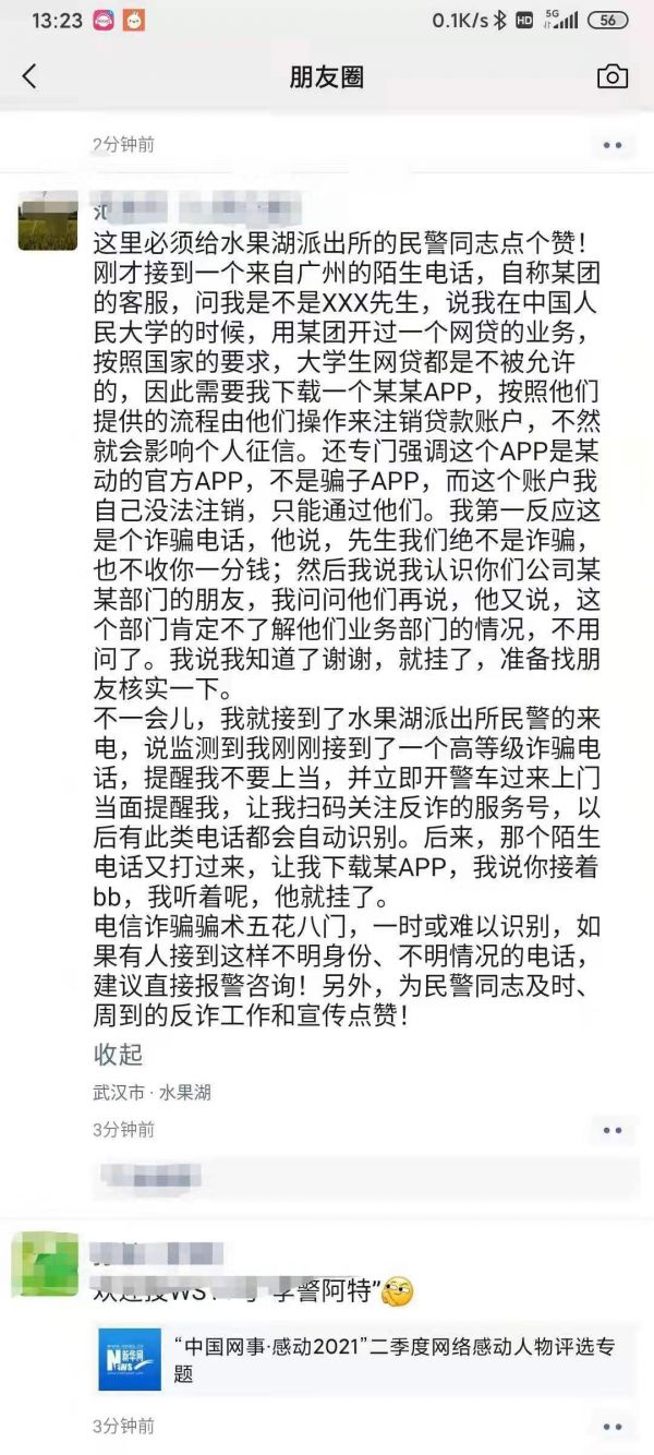 再次挂断电话后,晓浩发了一则朋友圈:“电信诈骗骗术五花八门,一时或难以识别,如果有人接到这样不明身份、不明情况的电话,建议直接报警咨询!另外,为民警同志及时、周到的反诈工作和宣传点赞!”(通讯员卞鸿飞 长江日报记者戴旻阳)