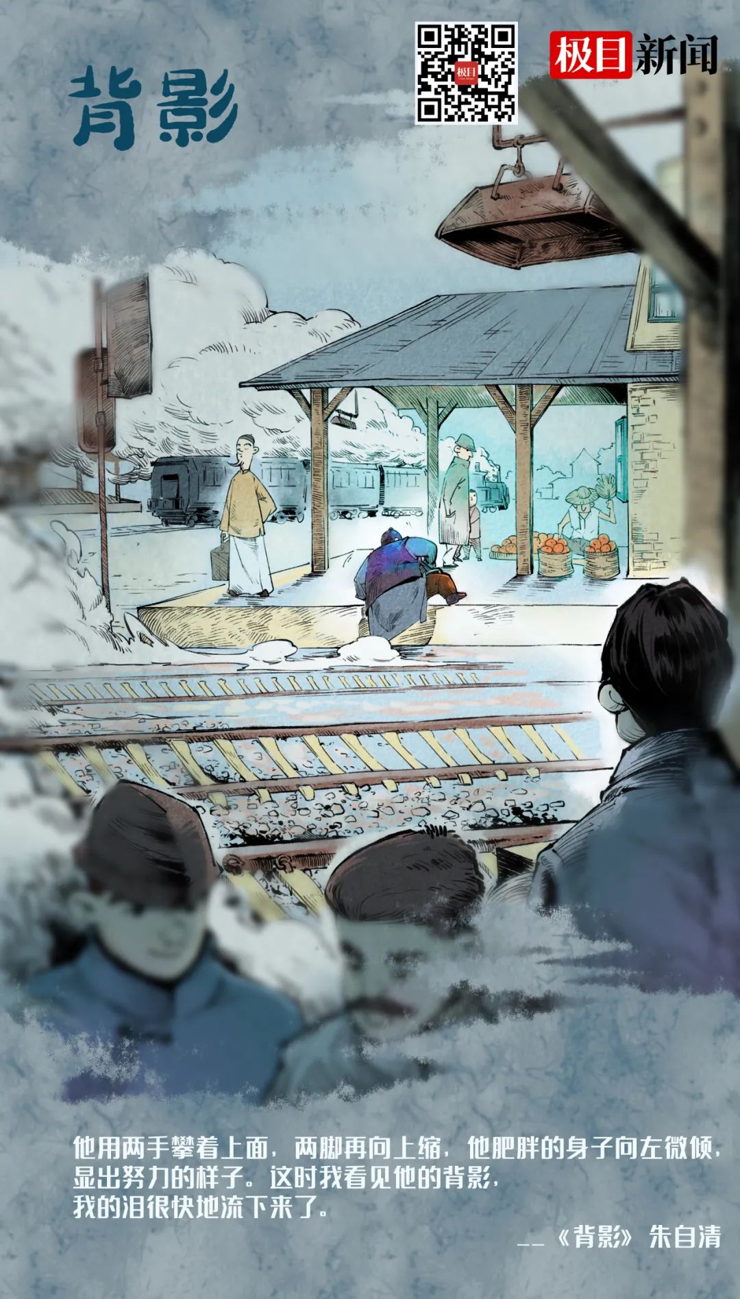 第二处:等父亲的背影没入人群,再也看不到的时候,“我”眼泪又流下来了;