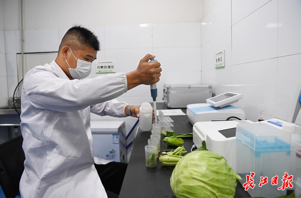 市场工作人员对售卖蔬菜进行农残抽检。 长江日报记者高勇 摄