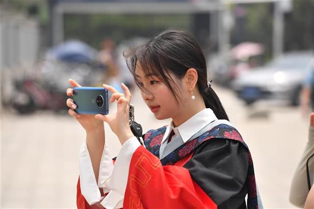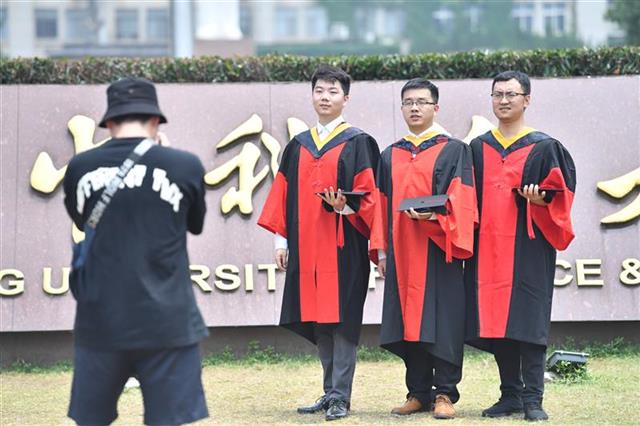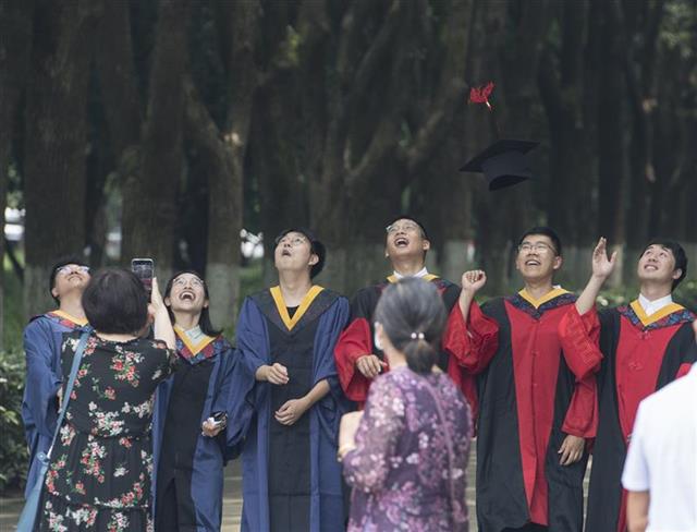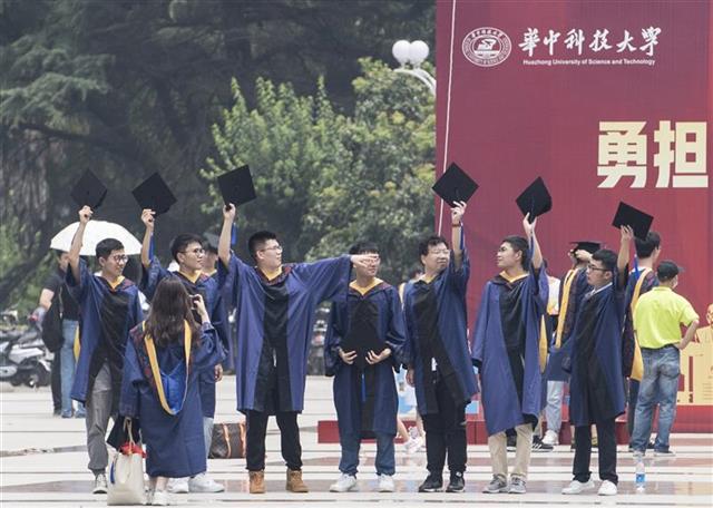 6月22日,华中科技大学,刚参加完毕业典礼的2021届研究生毕业生们纷纷来到校门前拍照留念。近日,武汉众多高校迎来毕业季,毕业生们即将走出校门,开启新的征程。2021年,武汉地区应届高校毕业生规模将达到32.7万人,超过2020年的31.7万人,再创历史新高。