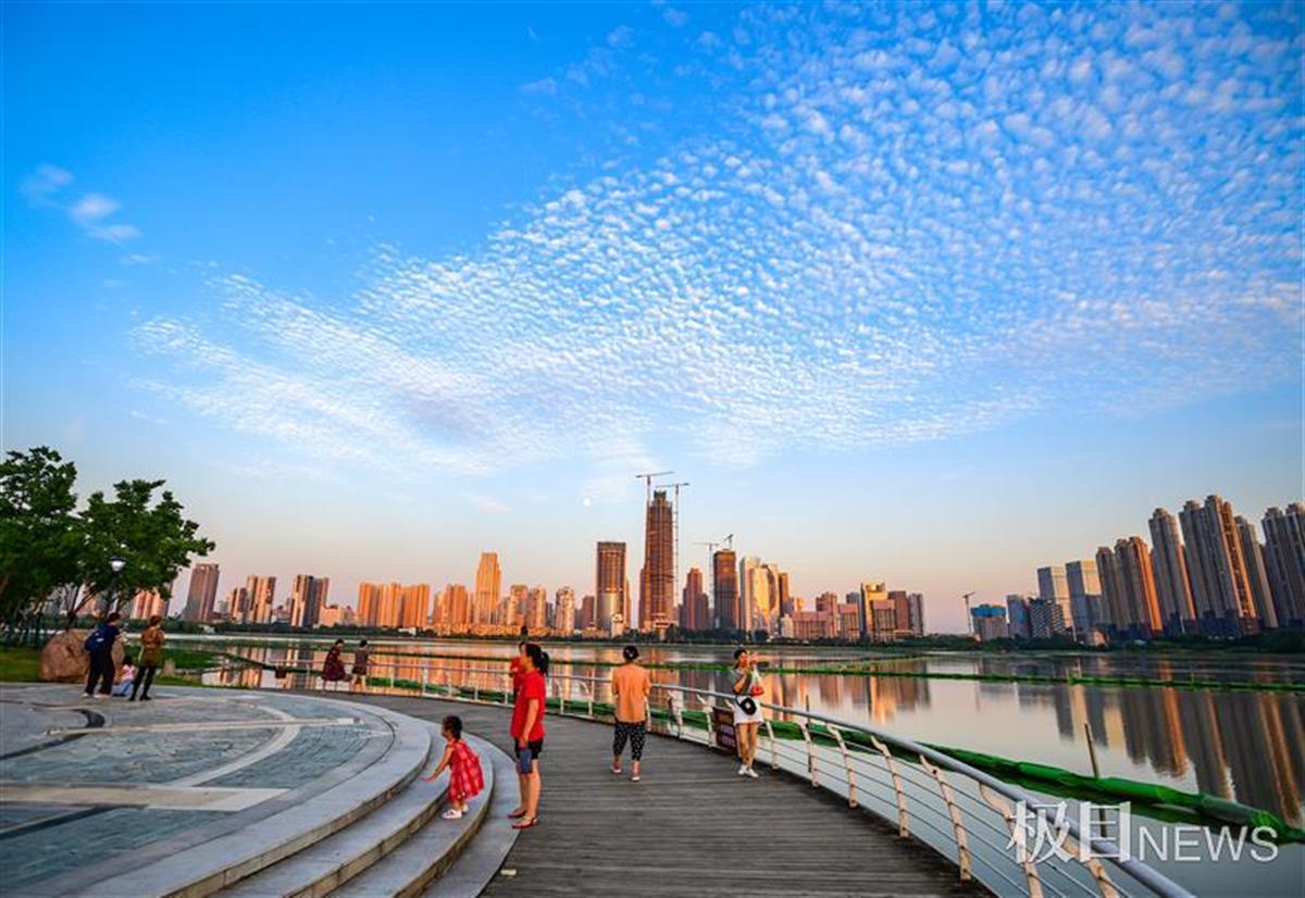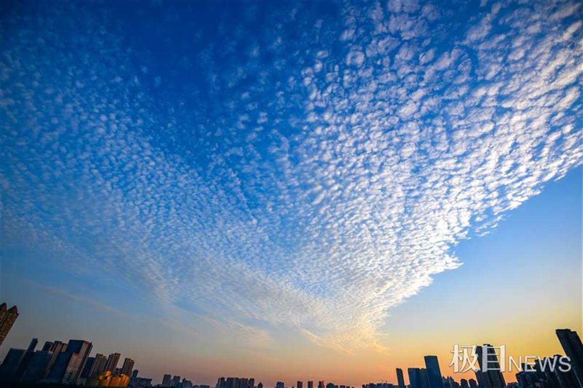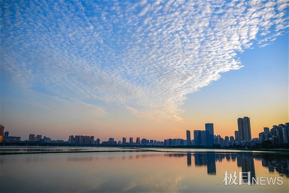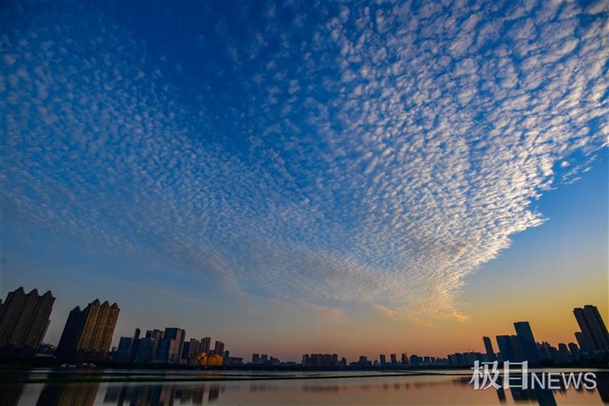6月23日下午7时许,月亮慢慢的从地平线升起,西边的落日缓缓下降,蓝天下滚滚鱼鳞纹状白云铺满了天空,衬托着刚刚升起的月亮。而日落的霞光万丈,将西边的云彩燃烧成艳丽的火团,红的太阳,蓝的月亮在天空同框争辉,将江城的天空妆扮得瑰丽神奇。