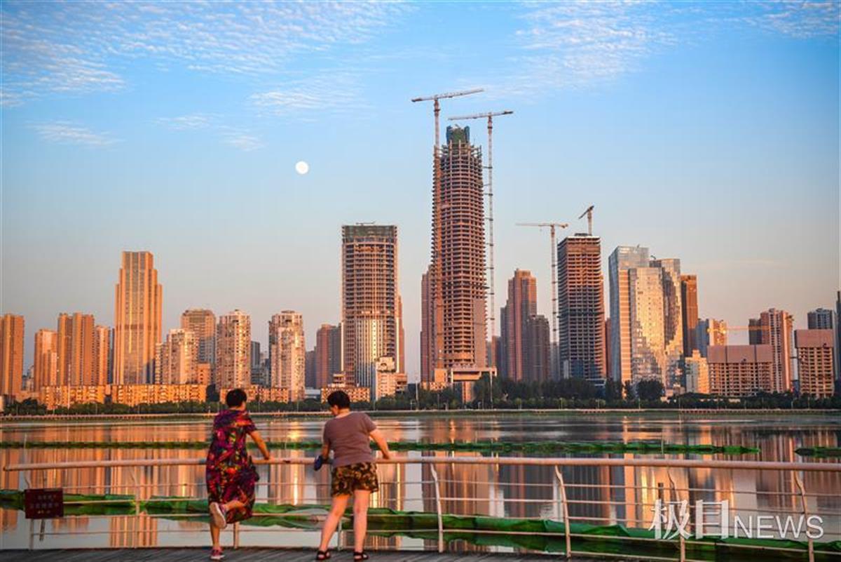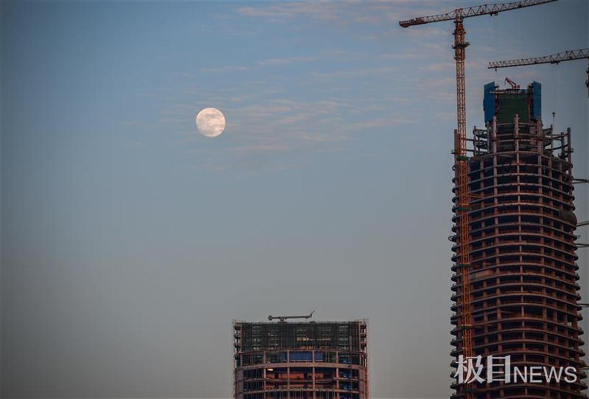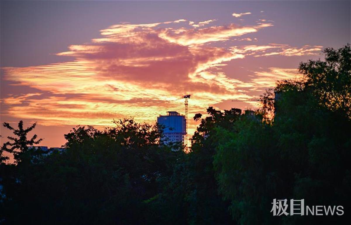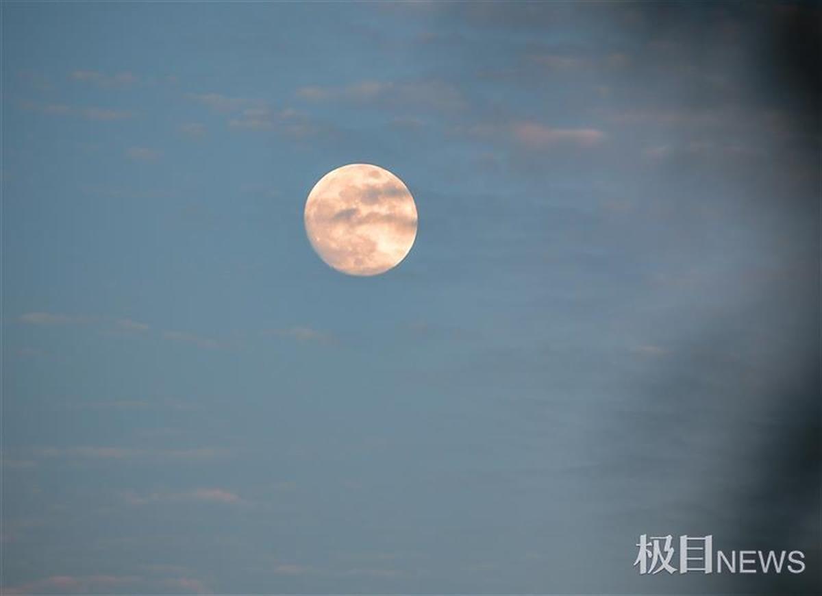 6月23日下午7时许,月亮慢慢的从地平线升起,西边的落日缓缓下降,蓝天下滚滚鱼鳞纹状白云铺满了天空,衬托着刚刚升起的月亮。而日落的霞光万丈,将西边的云彩燃烧成艳丽的火团,红的太阳,蓝的月亮在天空同框争辉,将江城的天空妆扮得瑰丽神奇。