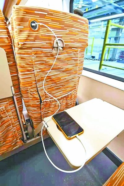 二等座椅靠背上增加了USB充电接口,方便旅客使用手机和充电。加深小桌板杯托凹槽深度,增强水杯放置的稳定性。