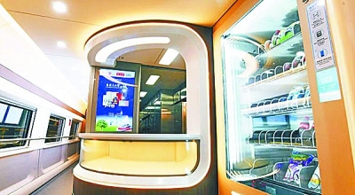餐车增设1台自动售货机,可为旅客提供自助购买水果、饮料、零食等服务。