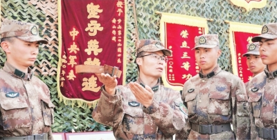 2021年2月1日,陆军第75集团军某旅“坚守英雄连”指导员姜勇军(左二)结合新兵入连仪式讲述“半截皮带”的故事。
