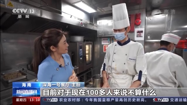 深海一号餐厅 主厨:目前对于现在100多人来说不算什么。前段时间我们也是6个人团队,大家团队配合,300多号人都轻松搞定。