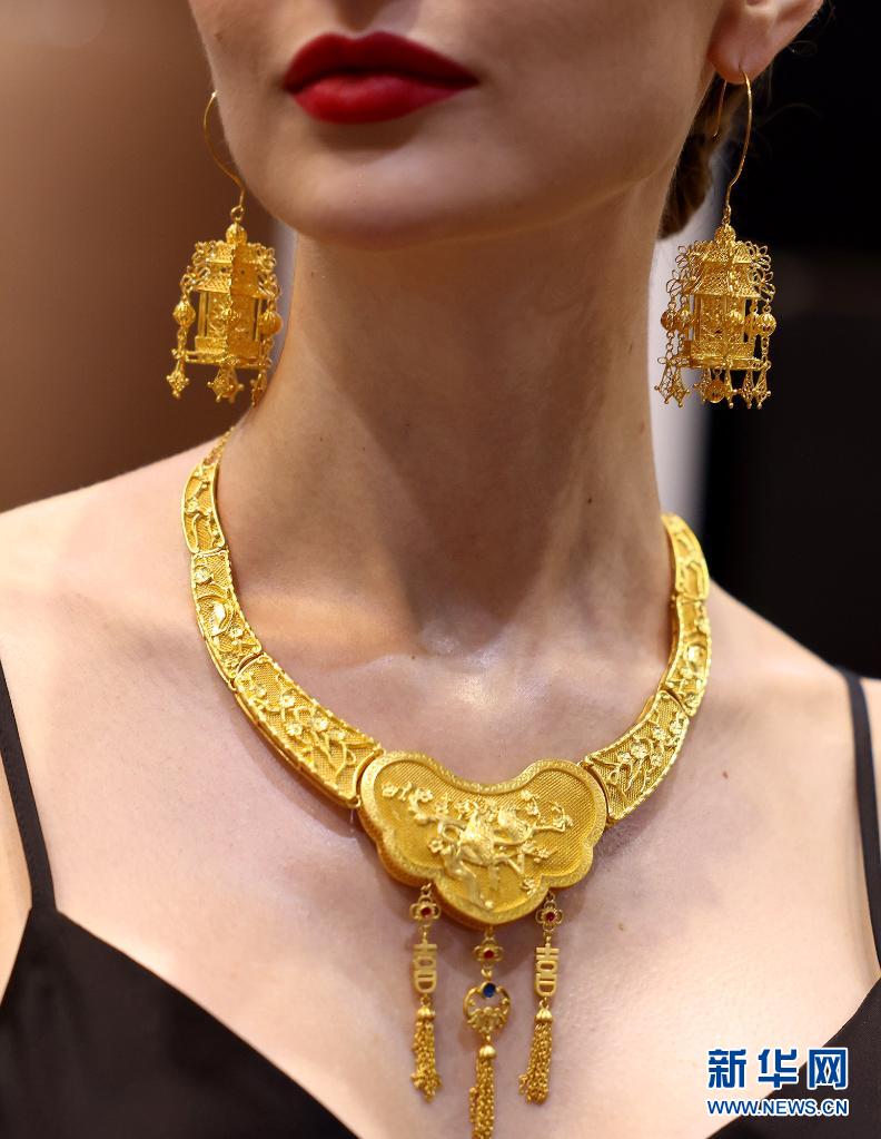 6月24日,模特在上海国际珠宝首饰展览会上展示婚庆系列黄金饰品。