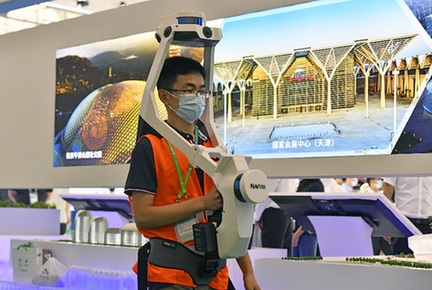 6月24日,在国家会展中心(天津)一期展馆,参展企业工作人员在展示智能测绘设备。当日,国家会展中心(天津)一期展馆迎来首展——中国建筑科学大会暨绿色智慧建筑博览会,本次博览会为期4天,将于6月27日闭幕。