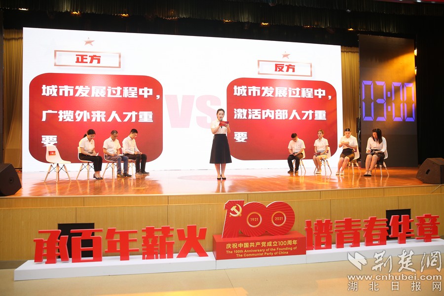 “百名优青献礼建党百年”活动由中共江夏区委、江夏区人民政府指导,中共江夏区委组织部主办,江夏青苹果乐园、荆楚网(湖北日报网)承办,楚天网络评论研究院联办。活动自5月初启动以来,吸引江夏区千余名青年干部参与,通过征文、演讲预选赛、即兴演讲、业务才艺比拼等环节,最终32名“优青”进入到今天的辩论总决赛。