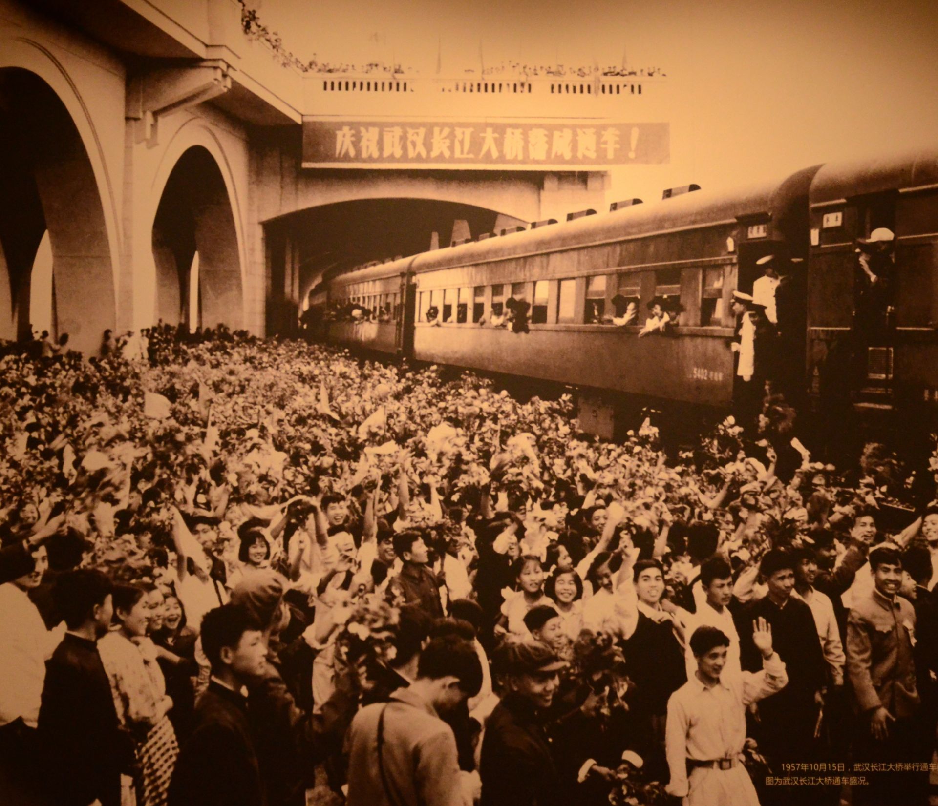 展览中庆祝武汉长江大桥落成通车的巨幅高清照片,首次向观众展出。