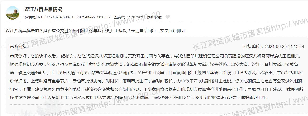 长江日报记者注意到,近期,不少网民关心自家附近的交通出行问题,咨询道路、天桥、地铁等的建设进展,相关部门也一一作出答复。