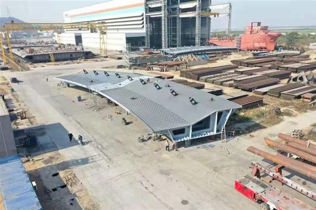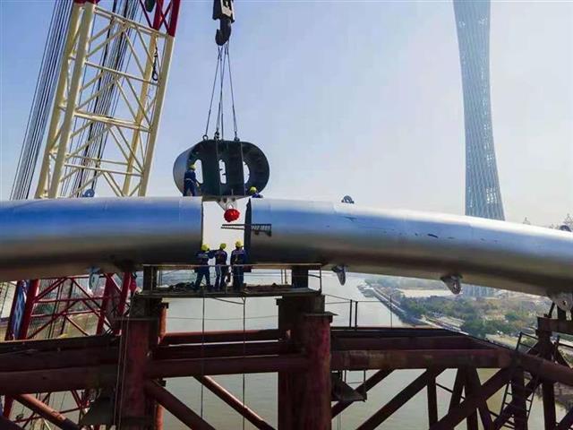 现场安装同样不分昼夜。海心桥总共32个节段,最重达450吨,采用600吨浮吊吊装。由于吊装工期紧,空间结构复杂,工况千变万化,施工难度和安全风险极大。中铁科工现场人员不畏艰难,连续奋战42天,于2月8日实现全桥合龙。