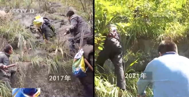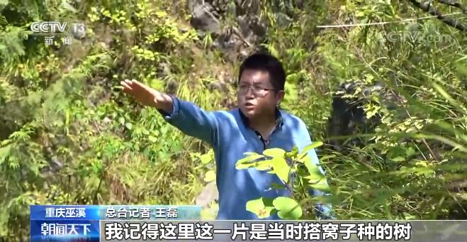 总台记者 王磊:现在我走的这条路就是当年和林云喜一起上山种树的路,这些大的石头还在,所以现在要爬上去还是得手脚并用。但是我们看这些石头缝里全都长出了草,我记得这里这一片是当时搭窝子种的树,刚种下的时候小树苗的高度就到我膝盖这个的位置,但是现在我们看这几棵树都有一人多高。