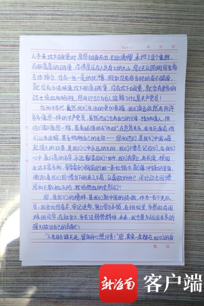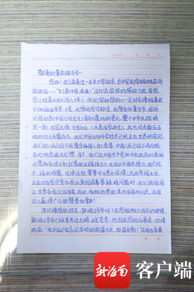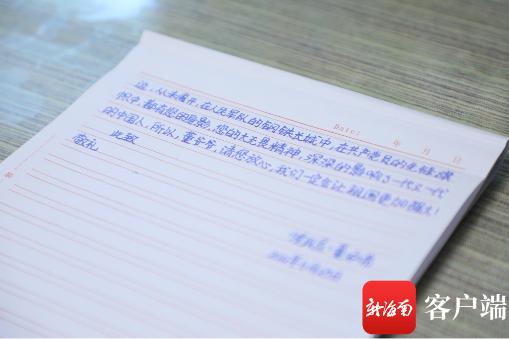 董泓希说,虽然董存瑞爷爷已经离开几十年了,但她认为董爷爷也会牵挂着祖国,她想通过这封信告诉董爷爷,中国现在已经发生了翻天覆地的变化。