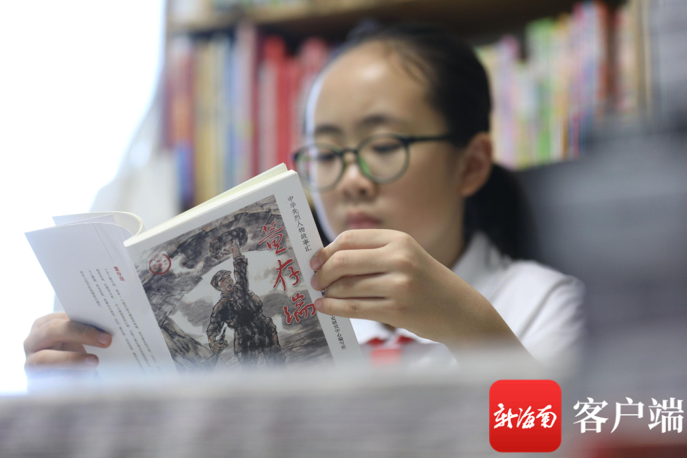 海口中学小学部四(2)班的学生董泓希正在看董存瑞爷爷的书籍。记者 吴兴财 摄