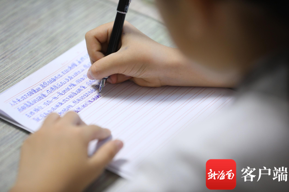 海口中学小学部四(2)班 的学生董泓希正在家中写信。记者 吴兴财 摄