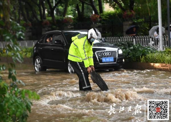 东西湖金银湖马池路段因强降雨致使部分路段渍水,东西湖区交通大队民警发现车辆熄火及时上前帮助将车辆推出渍水区。截至发稿,渍水正迅速消退。
