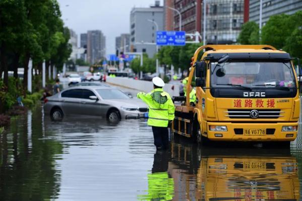 在汉阳区隆祥街,因暴雨造成部分路段渍水,几辆小汽车行驶中熄火。汉阳区交通大队三中队紧急调集救援车,对受困汽车进行施救。