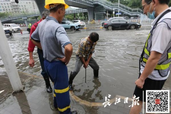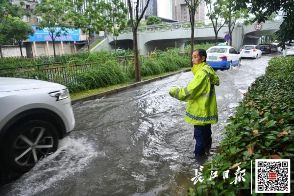 今日中午,在唐家墩路马场路人行天桥路段,由于积水较多,江汉区水务局防汛抢险人员10时左右及时赶到现场,进行抢险抽排。据介绍,水务局排水队员25日19时就开始在该滞水点防汛值守。