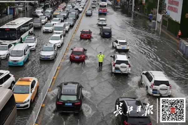 今日中午,唐家墩路马场路人行天桥路段部分道路车道积水,江汉交通大队警务人员冒雨在该路段疏导交通,确保道路安全畅通。