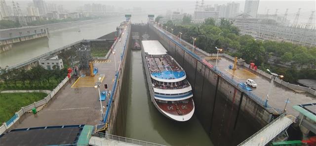 湖北日报讯(记者戴辉、通讯员向俊松、刘敏)6月27日,薄雾细雨似在为葛洲坝船闸一洗征尘。这个通航满40周年的船闸,一如平常的繁忙,货船“天畅”、客轮“总统7号”等上下行船舶往来穿梭,游船上的乘客撑伞拍摄闸门运行,见证“万里长江第一坝”的壮观。