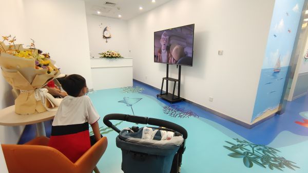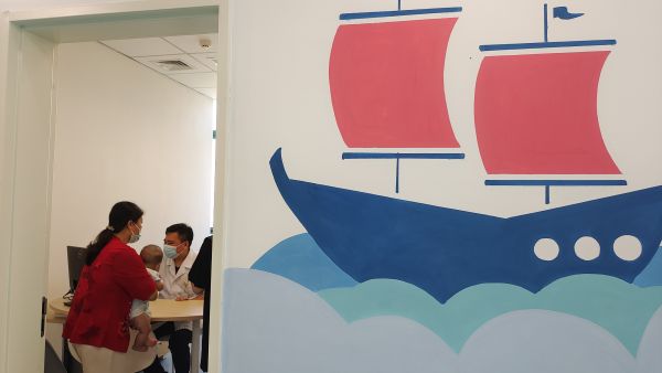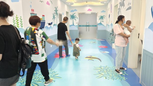与常见病区不同的是,儿童体检中心装扮得很有童心:从地面到墙面都画上了各种卡通海洋动物,进入走廊,犹如走进海底隧道。在为婴幼儿提供发育评估的诊室内,也可见到贝壳、乌龟等卡通元素。