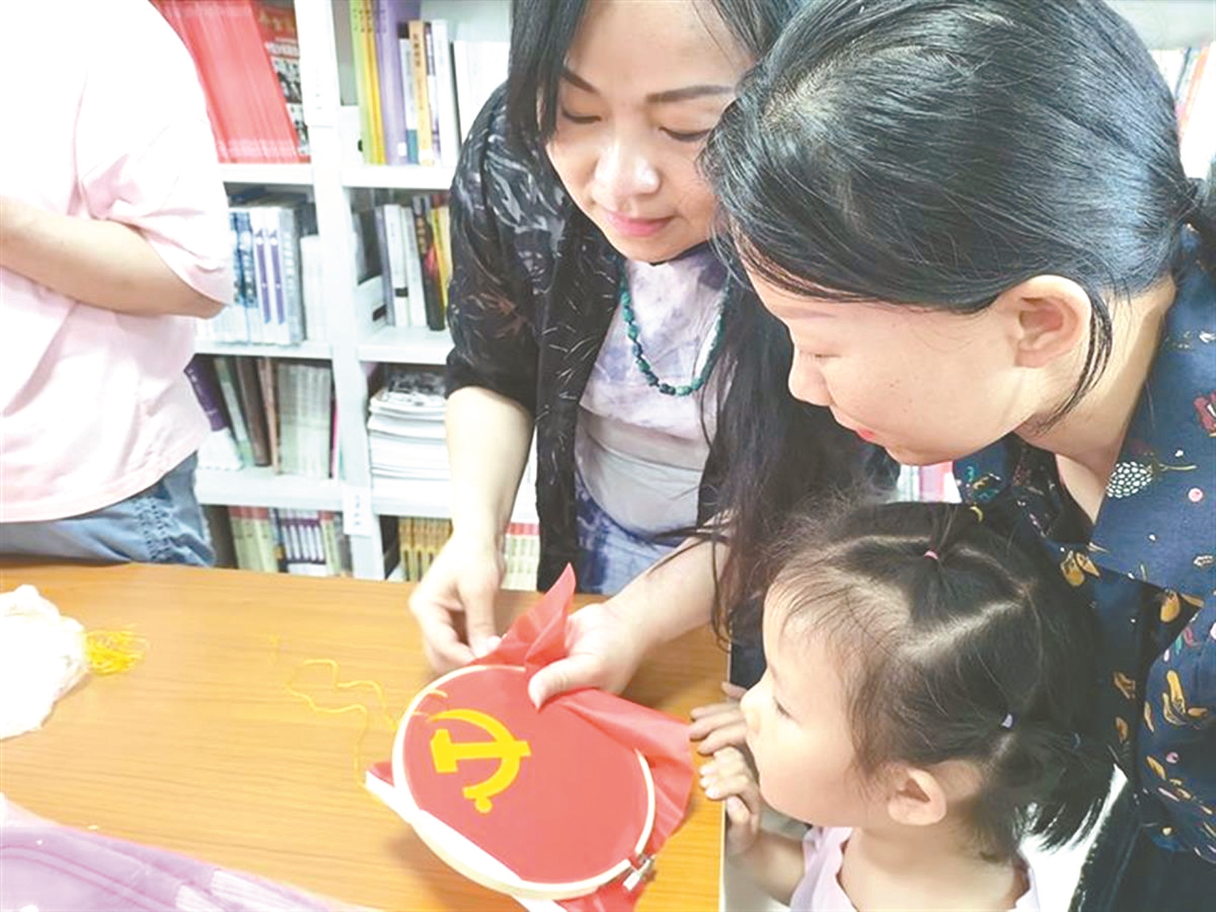 汉绣传承人黄春萍等教小朋友绣党旗。