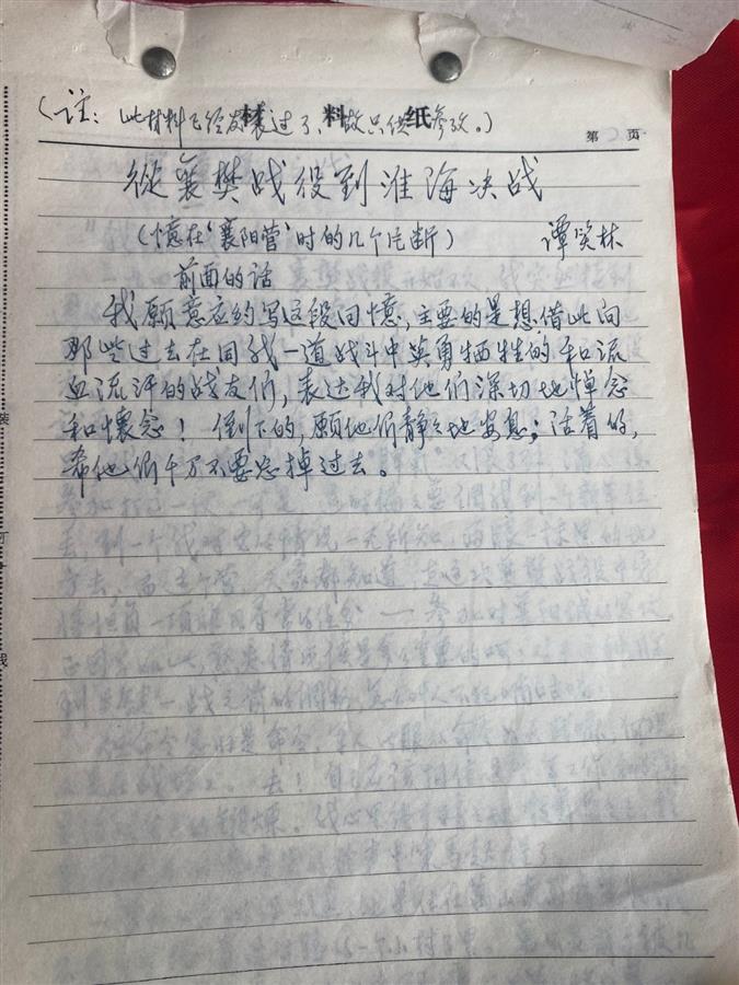 谭老离休后,撰写了《缤纷人生》的回忆录,用了大量章节回忆襄樊战役的过程。他一直想回襄阳看看,然而,2016年因病去世,此时离那段战事已过去68年。去世前,他跟子女交代,遗愿就是把《缤纷人生》的手稿捐赠给襄阳。谭笑林的女儿谭华告诉极目新闻记者,他们兄妹几个帮父亲整理手稿花了一两年的时间。这其中最主要原因是父亲在写的时候习惯用各种各样他自己才看得懂的符号。为了翻译这些符号耗费了很多时间精力。但是,唯独对襄樊战役这部分,父亲没有用任何符号,而是完完整整详细地记录下当时战场上经历的一切。