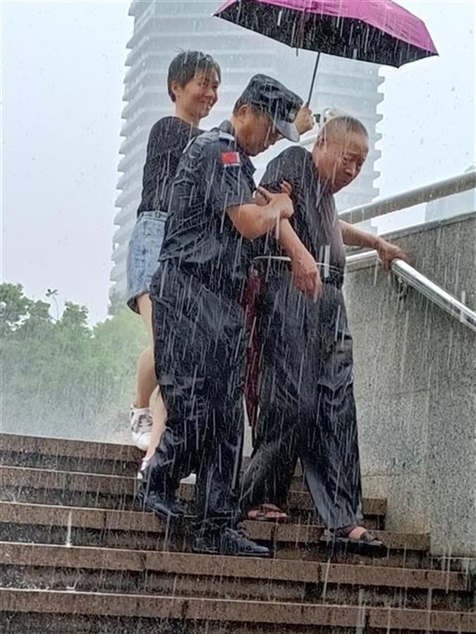 根据吕女士提供的照片,极目新闻记者发现,照片拍摄的时间是6月30日10时6分,画面中,暴雨如注,一位穿黑色制服的男子双手扶着一位老人下楼梯,老人的左侧,一名女子手持拐杖,在为老人撑伞。画面中,穿黑色制服男子全身被雨水浸透,但依然努力搀扶老人,尽力不让老人淋雨、摔倒。