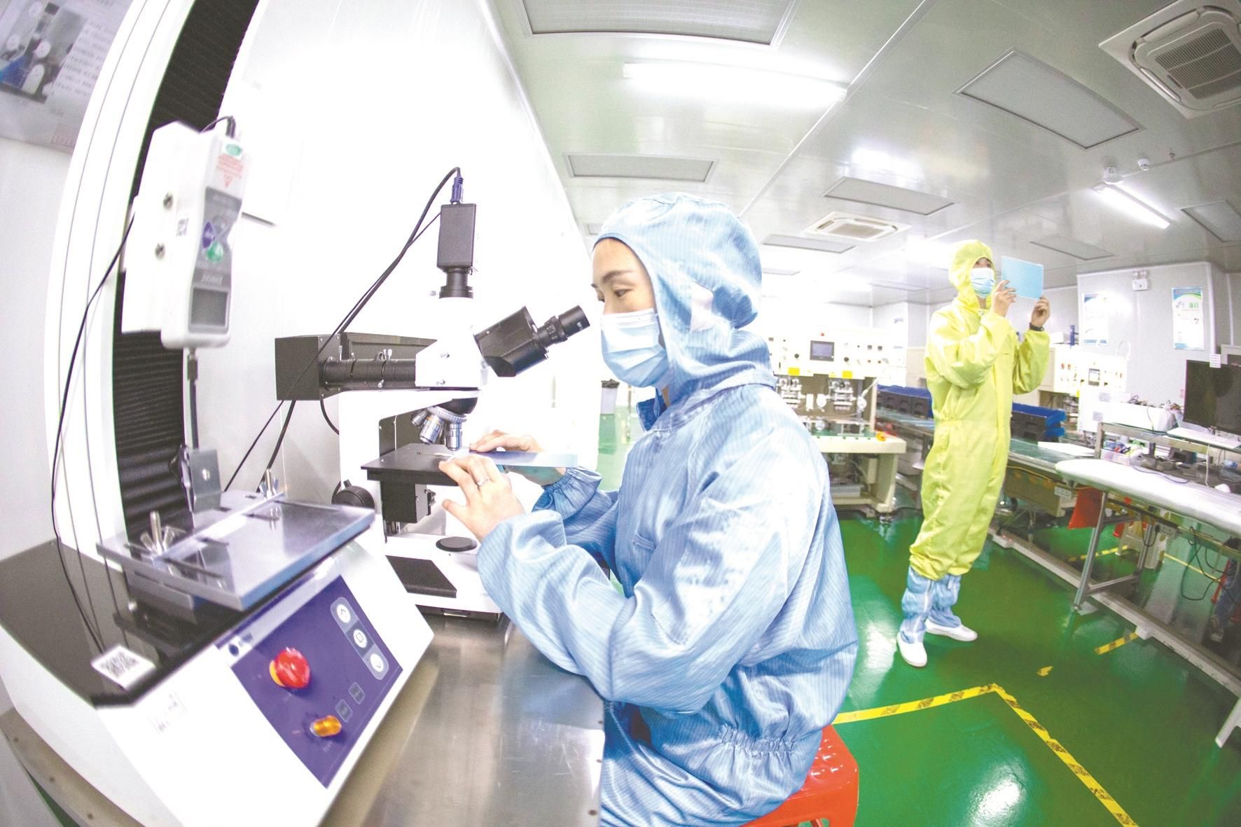 大冶湖高新区,湖北信永辉电子科技有限公司员工在无尘车间内赶制订单。