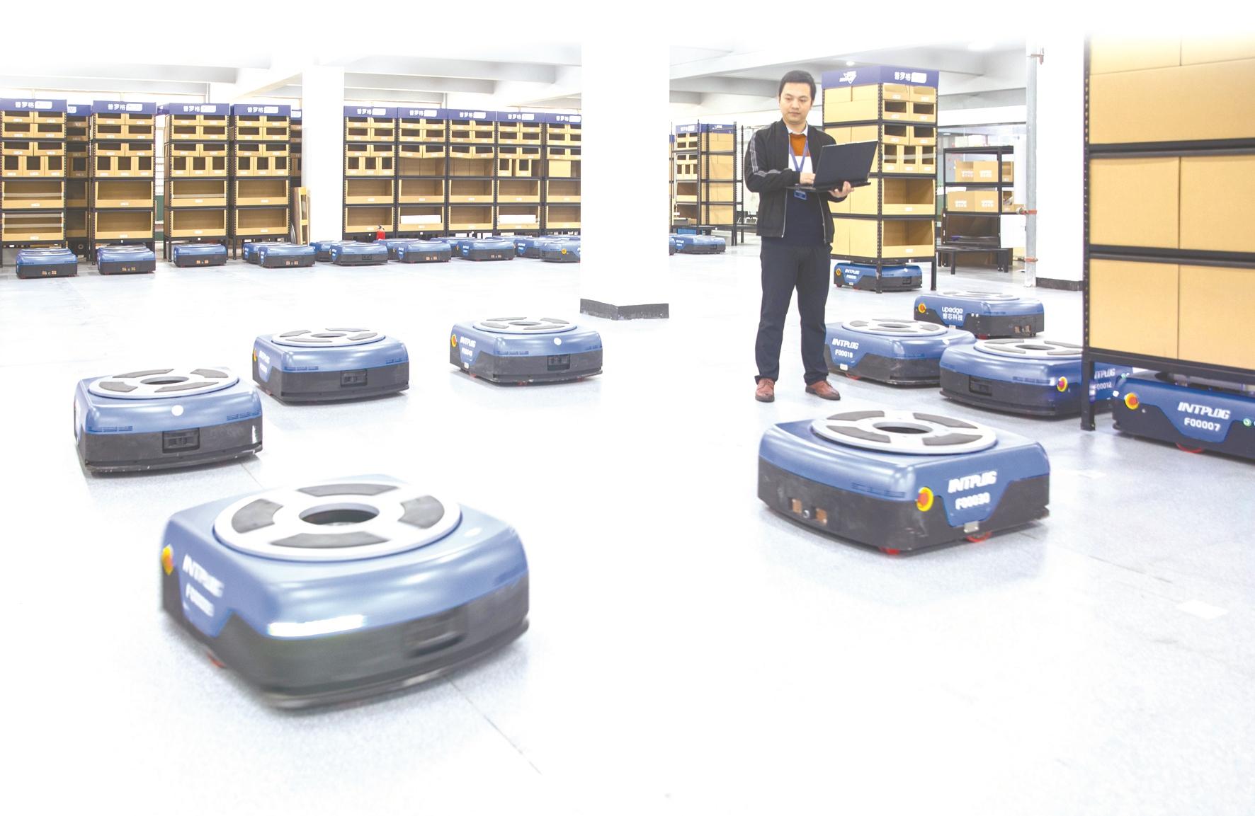 大冶湖高新区,普罗格智芯科技(湖北)有限公司技术人员在调试智能导航搬运机器人。