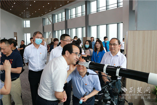 在文化体验区更有丰富有趣的文化体验:“一叶红船,流光百年”红船打卡区前人们纷纷拍照留念,将红船精神铭记于心;“百年党史我来答”党史知识答题现场既紧张又欢乐,参与者答题时眉头紧锁,答对时拍手欢呼,并在留言板上写下对党的百年祝福;窗边的望远镜更是锦上添花,体验“万里长江横渡,极目楚天舒”的豪迈,黄鹤楼、龟山电视台……尽收眼底。