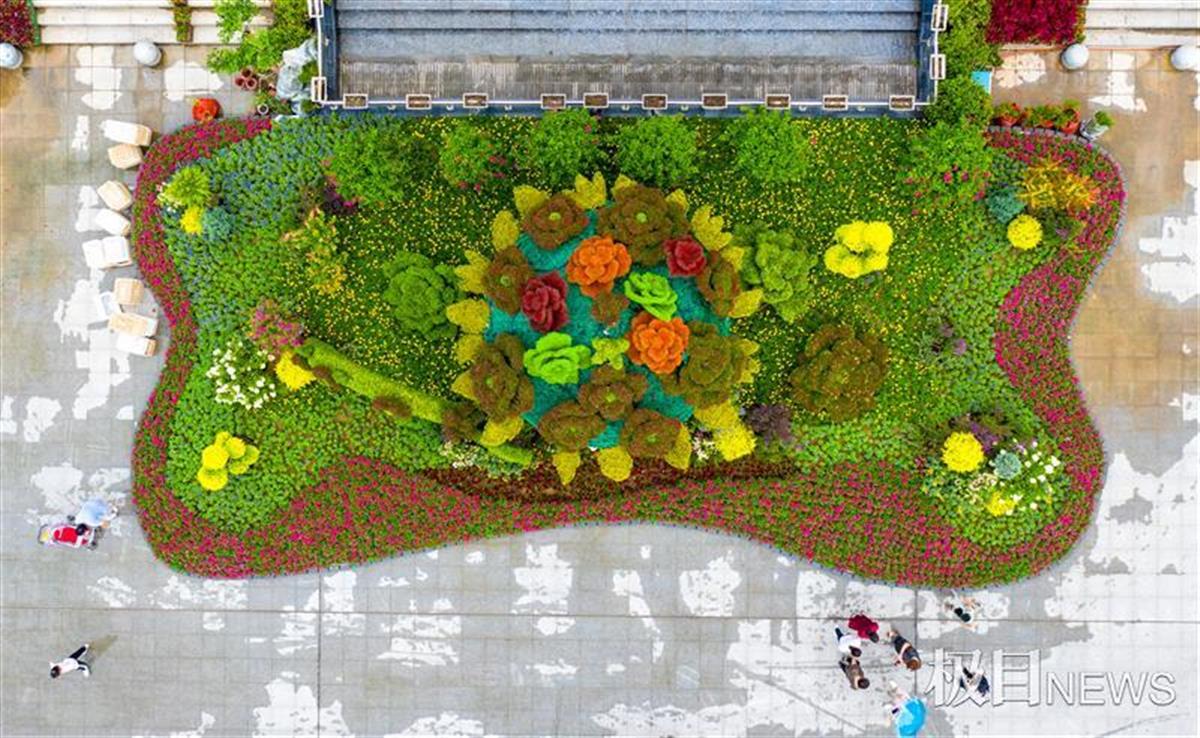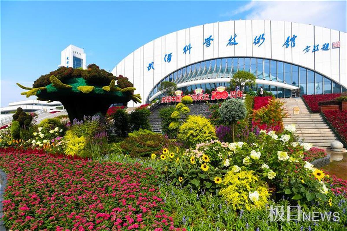 武汉科技馆门口的绿雕吸引众多市民游客驻足留影。这里的绿雕以喜庆热闹的花篮扎景、花境、台阶摆花形成一幅热烈、喜庆的节日画卷。其中主景为6米高、6米宽的花篮扎景,构成主次分明、色彩鲜艳的三维立体画卷。