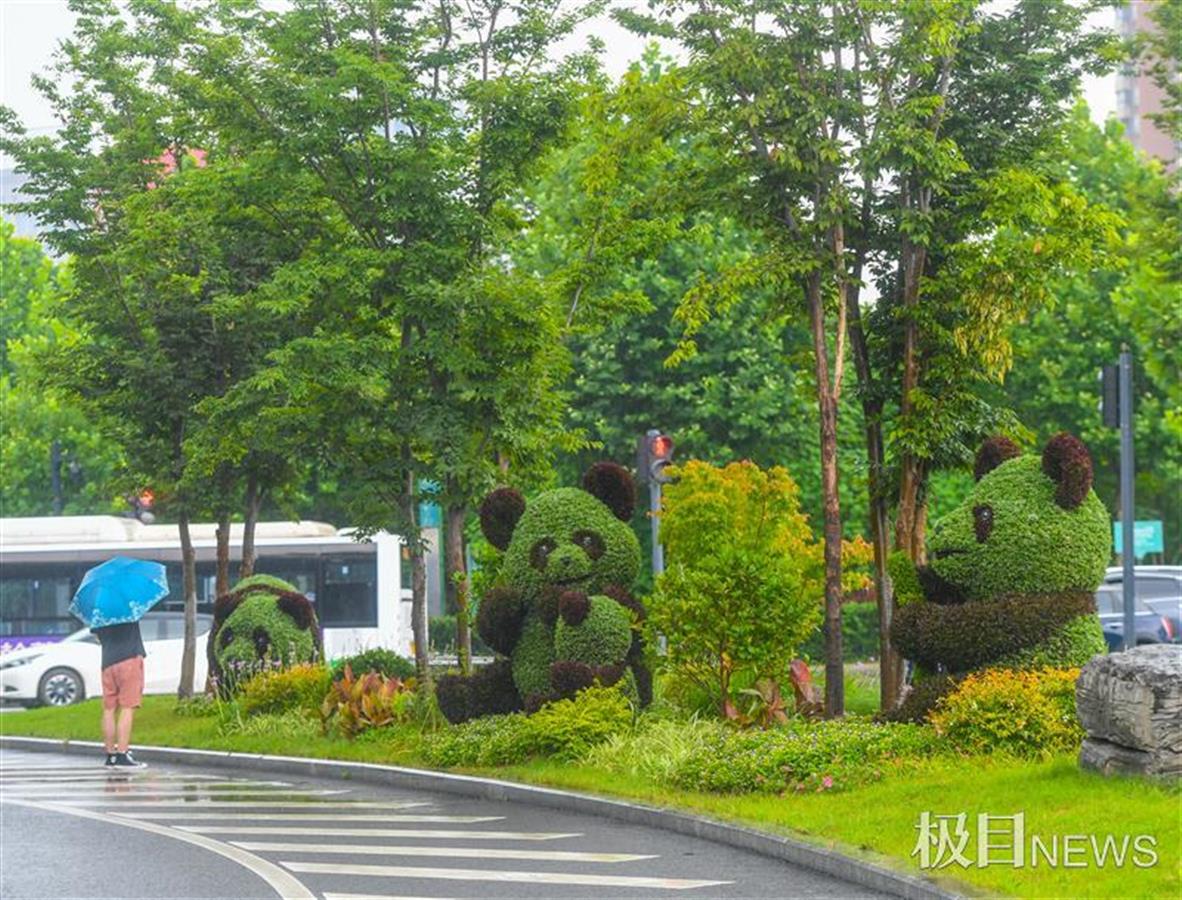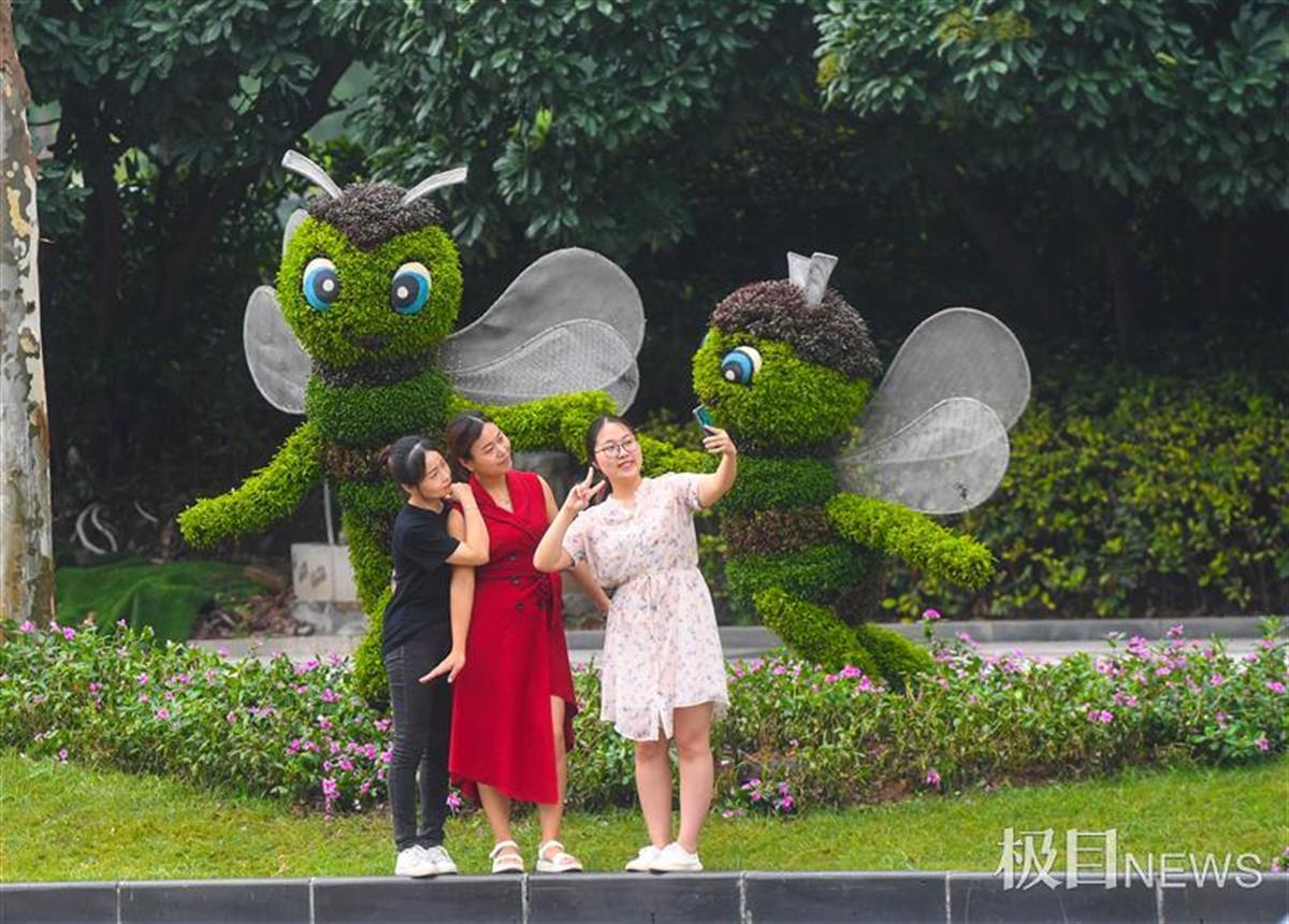 还有不少绿雕烘托喜庆的节日气氛:在黄埔大街工农兵路上翩翩起舞的小蜜蜂、长江二七桥下憨态可掬的大熊猫,与现有的花丛融为一体,充满童趣。