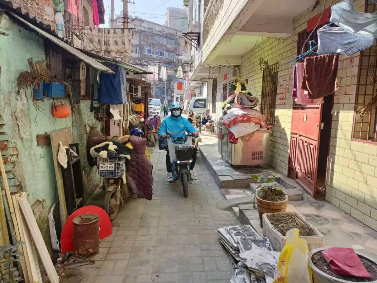 盒马小哥在汉口老旧社区送货。