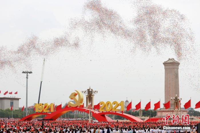 7月1日上午,庆祝中国共产党成立100周年大会在北京天安门广场隆重举行。图为庆祝大会现场放飞气球。 中新社记者 韩海丹 摄