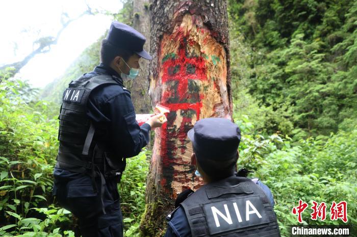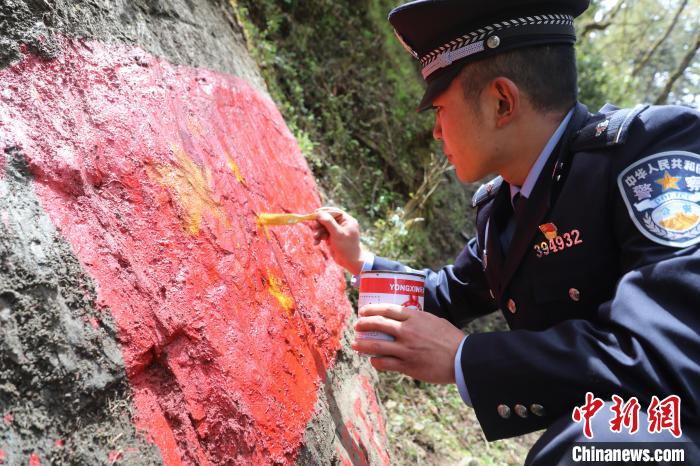 图为玉麦边境派出所移民管理警察在边境一线对国旗、中国字样等主权标志物描红。 山南边境管理支队供图