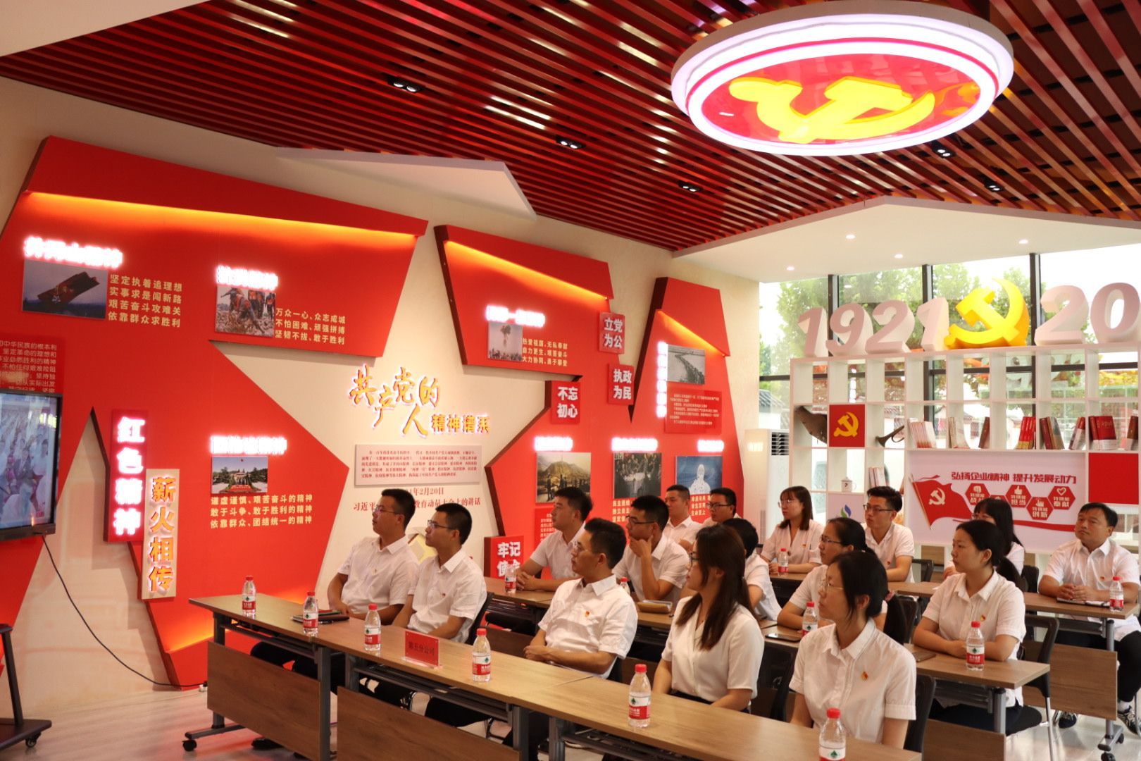 早上,在武汉市市政建设集团高新大道项目部的红色教育基地,十余名党员也收看了庆祝中国共产党成立100周年大会。