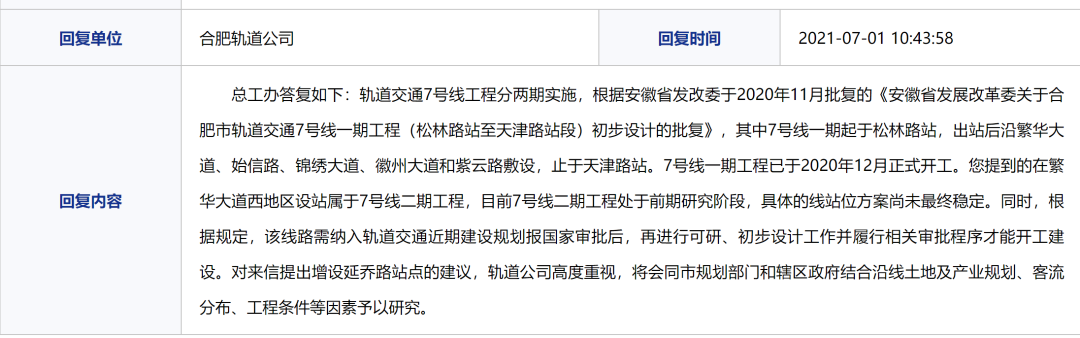 总工办答复如下:轨道交通7号线工程分两期实施,根据安徽省发改委于2020年11月批复的《安徽省发展改革委关于合肥市轨道交通7号线一期工程(松林路站至天津路站段)初步设计的批复》,其中7号线一期起于松林路站,出站后沿繁华大道、始信路、锦绣大道、徽州大道和紫云路敷设,止于天津路站。7号线一期工程已于2020年12月正式开工。您提到的在繁华大道西地区设站属于7号线二期工程,目前7号线二期工程处于前期研究阶段,具体的线站位方案尚未最终稳定。同时,根据规定,该线路需纳入轨道交通近期建设规划报国家审批后,再进行可研、初步设计工作并履行相关审批程序才能开工建设。对来信提出增设延乔路站点的建议,轨道公司高度重视,将会同市规划部门和辖区政府结合沿线土地及产业规划、客流分布、工程条件等因素予以研究。