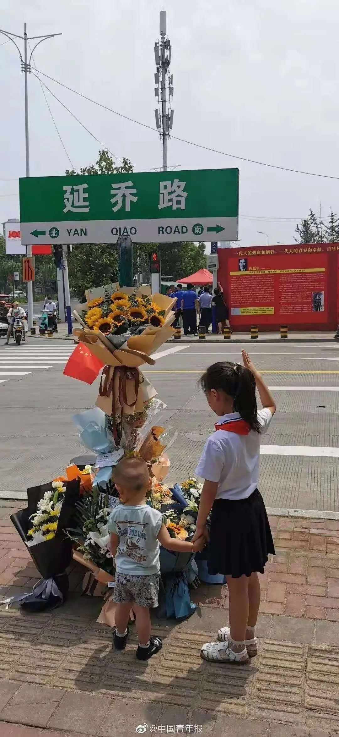 安徽合肥的“延乔路”,是为纪念革命烈士陈延年、陈乔年而命名的。6月30日起,市民自发在延乔路路牌下插上国旗,摆放鲜花、卡片。