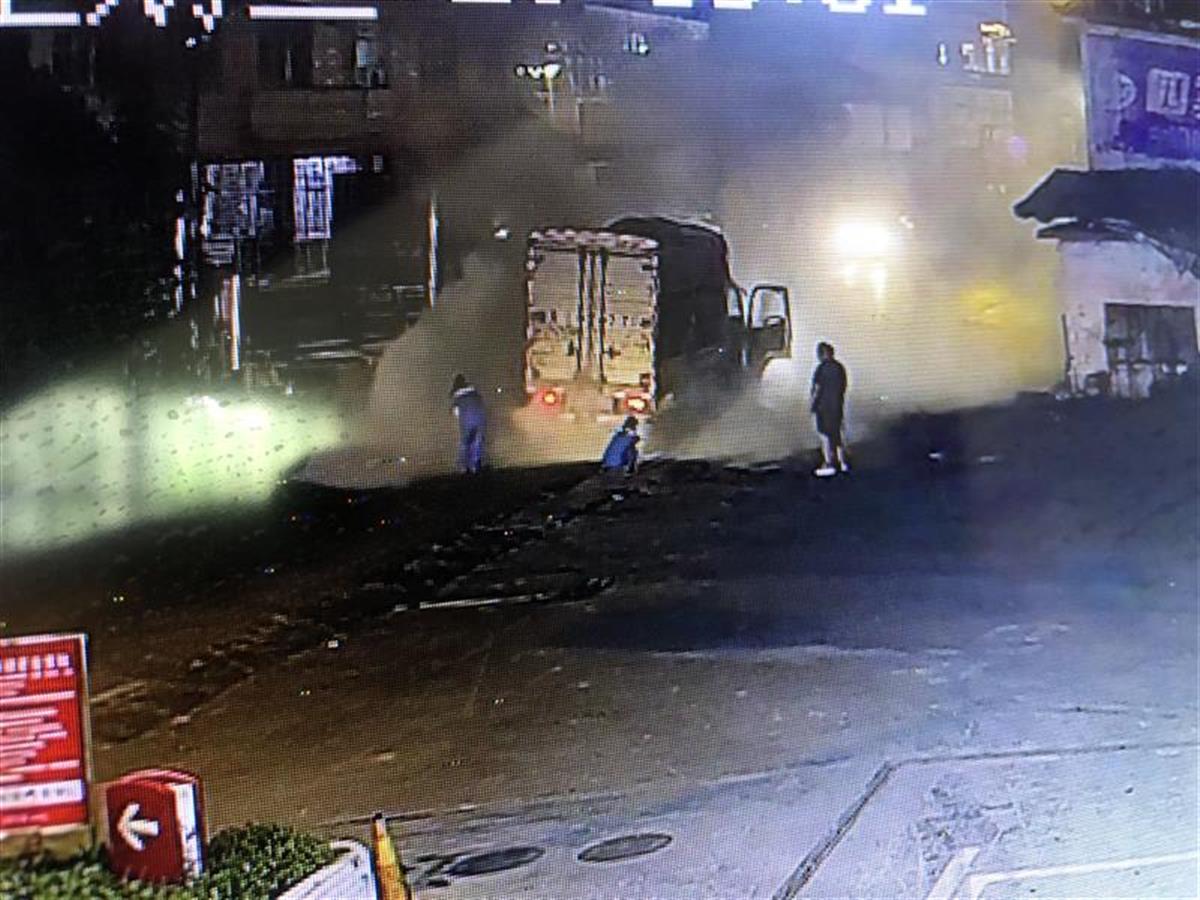 当晚近9时,喧闹一天的恩施市龙凤坝镇上逐渐恢复了平静,209国道上,一辆河南牌照的货车,装满了生猪经过此处。忽然,马路上传来一阵阵急促的喇叭声,原来,小货车轮胎忽然冒烟,很快就冒出火星,而司机还没察觉到。跟在货车后面的小轿车,看到前方车辆起火后,不断地按响喇叭,提醒货车司机。喇叭声引起货车司机注意,发现起火后,他紧急将车辆停在距离中石化新世纪加油站出口不足5米的地方。