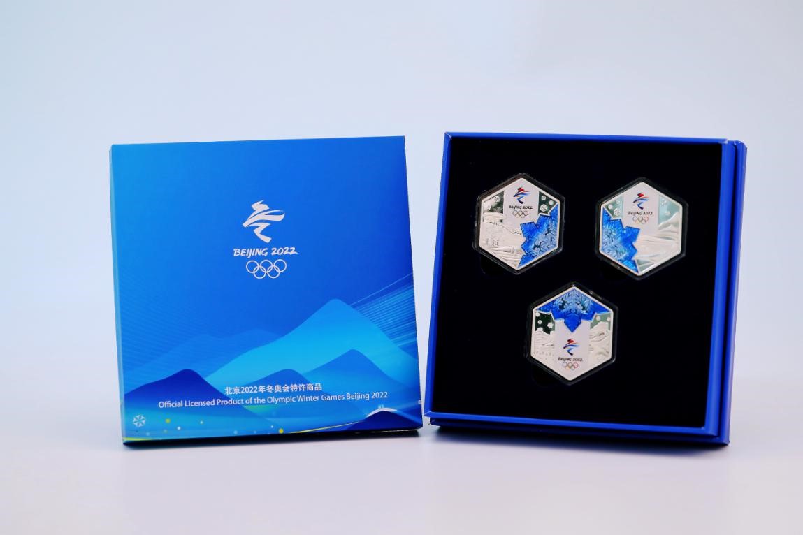 该款银章套装共包含有三枚六边形银章,银章正面图案分别为位于张家口赛区的国家跳台滑雪中心、位于北京赛区的国家速滑馆以及万里长城,正面中心部分拼接后即可呈现出一朵完整的雪花图案;银章背面分别为冰墩墩的跳台滑雪、速度滑冰运动造型以及标准造型,搭配精美的雪花底纹和北京冬奥会中英文名称。整体设计新颖有趣,采用油压、仿珐琅、彩印等工艺,每枚银章重20克,限量20000套。