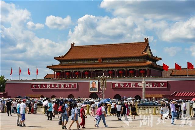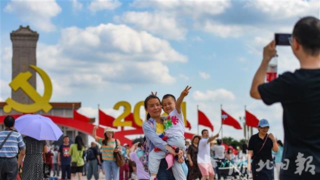 湖北日报全媒记者7月3日上午来到天安门广场,前来广场参观的游客人山人海。不少来自全国各地的游客携家人一道前来拍照留念。