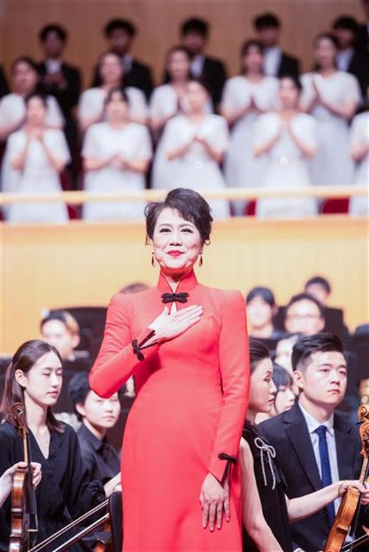 下半场,武音校友、著名作曲家邹野编创的管弦乐《我们曾经唱过》,唤醒时代记忆;民族女高音与管弦乐队作品《百年复兴梦》,抒发了人们强烈的爱国之情与报国之志。音乐会最后奏响经典名曲《红旗颂》,将气氛推向高潮,台上台下齐声合唱。