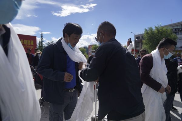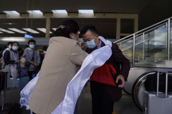 “谢谢老师们的关照,这一年您辛苦了”“有老师们一路护送回来,再远的路我们都不担心”……这批返藏的学生中,有不少人来自西藏山南市,他们的家长也特意提前从山南赶到拉萨,就是为了和武汉西藏中学的老师们见上一面,献上哈达,向他们表达谢意。每位老师身上都披上了一条又一条哈达,凝聚着家长和学校的浓浓情谊。