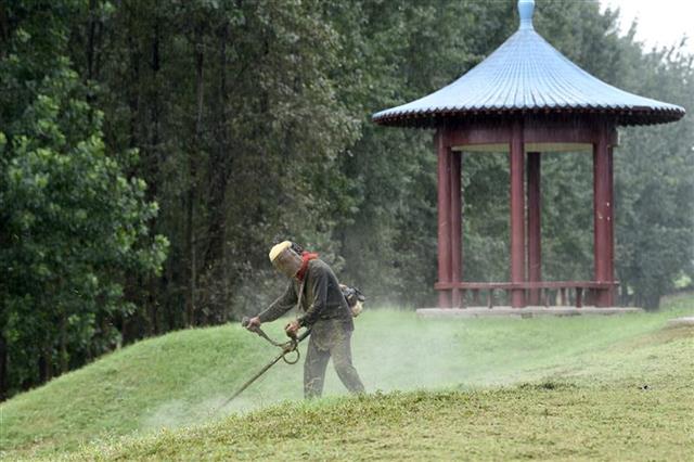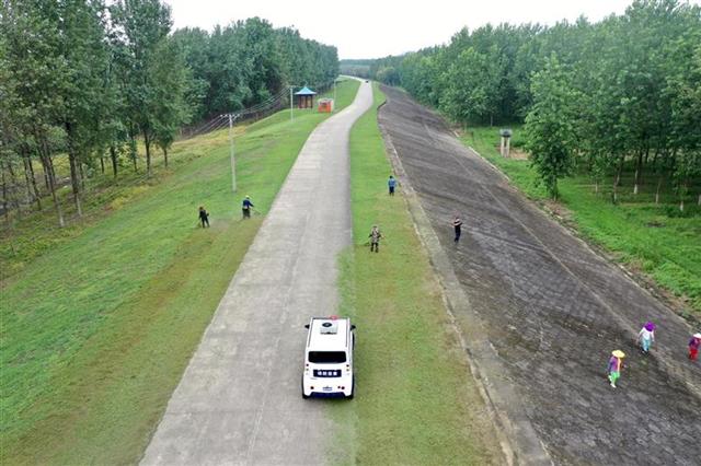 7月5日下午,长江干堤四邑公堤武汉江夏段,值守队员头顶烈日在堤内护坡上巡查,8名除草工人架着除草机正在进行堤防除草作业。17.5公里长的四邑公堤江夏段集中了致富险段、谭家窑险段、红灯险段、中湾险段、居字号险段、双窑险段等六大险段,是长江干堤武汉段最险的一段,险段比例高达70%。据江夏区河道堤防管理总段介绍,为了确保防汛安全,定期安排人员把内坡和内平台上的杂草进行清除,巡查险情一目了然。(湖北日报全媒记者 李溪 摄)