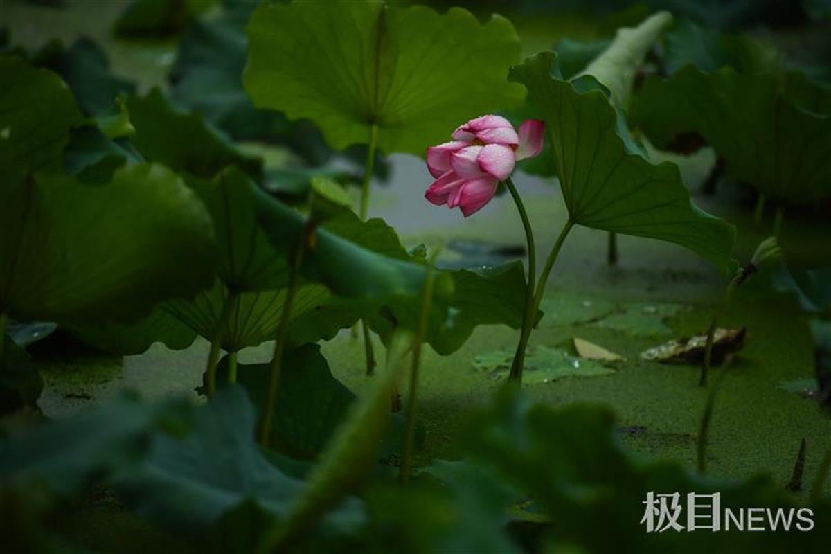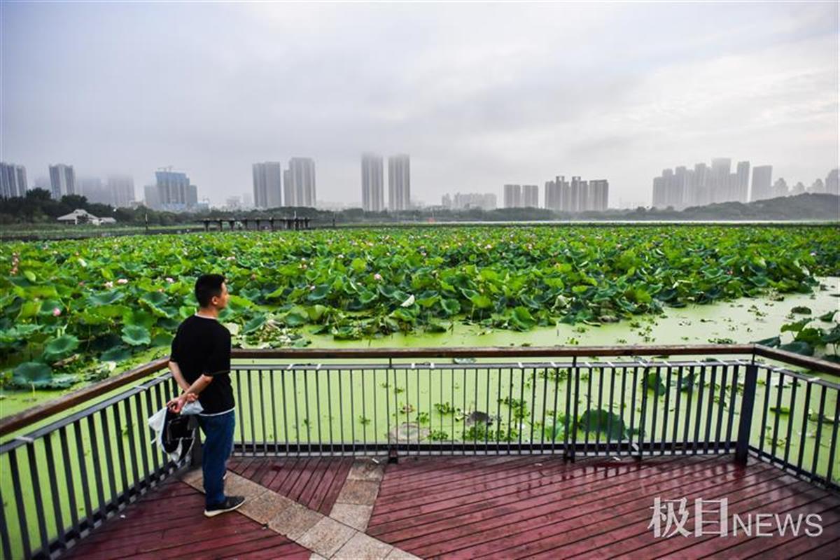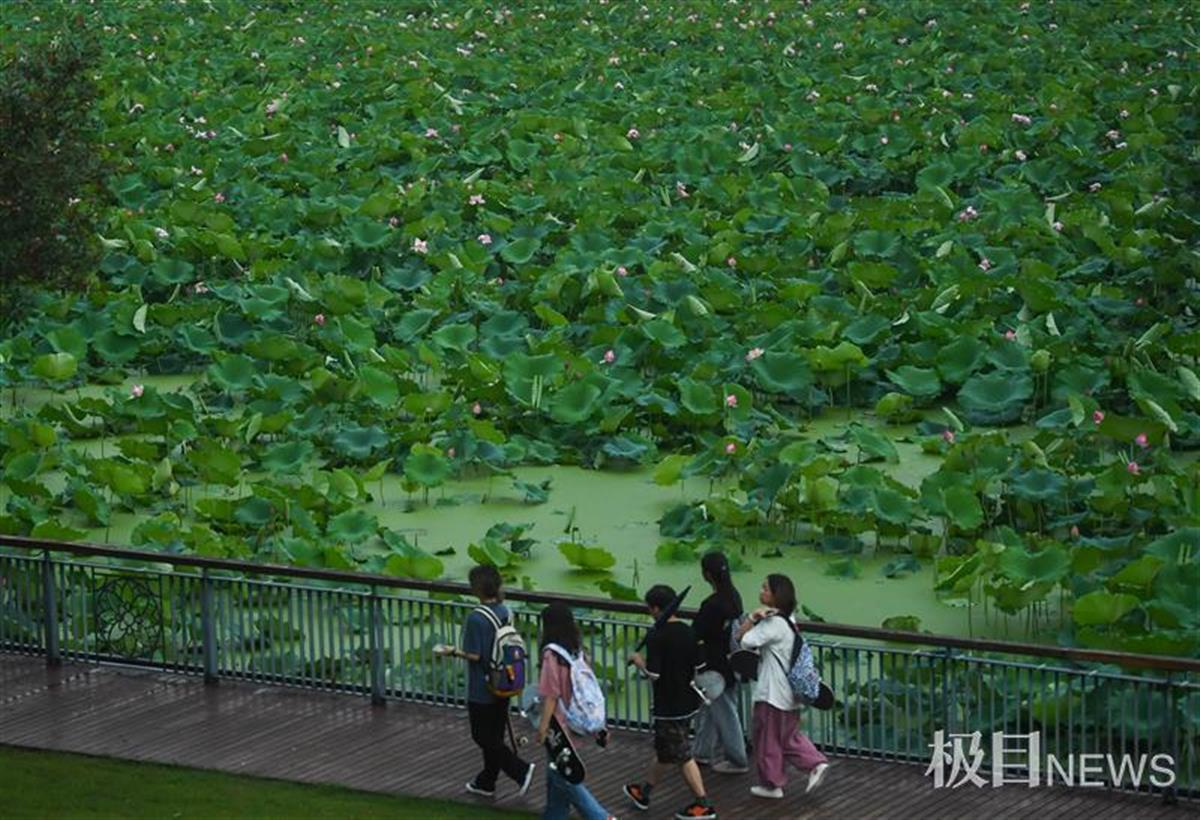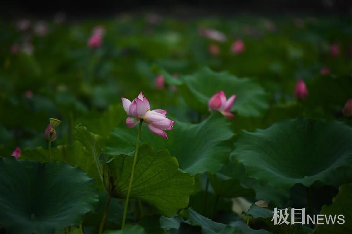 5日下午,天空转阴,在月湖一隅,大片荷花成片绽放。