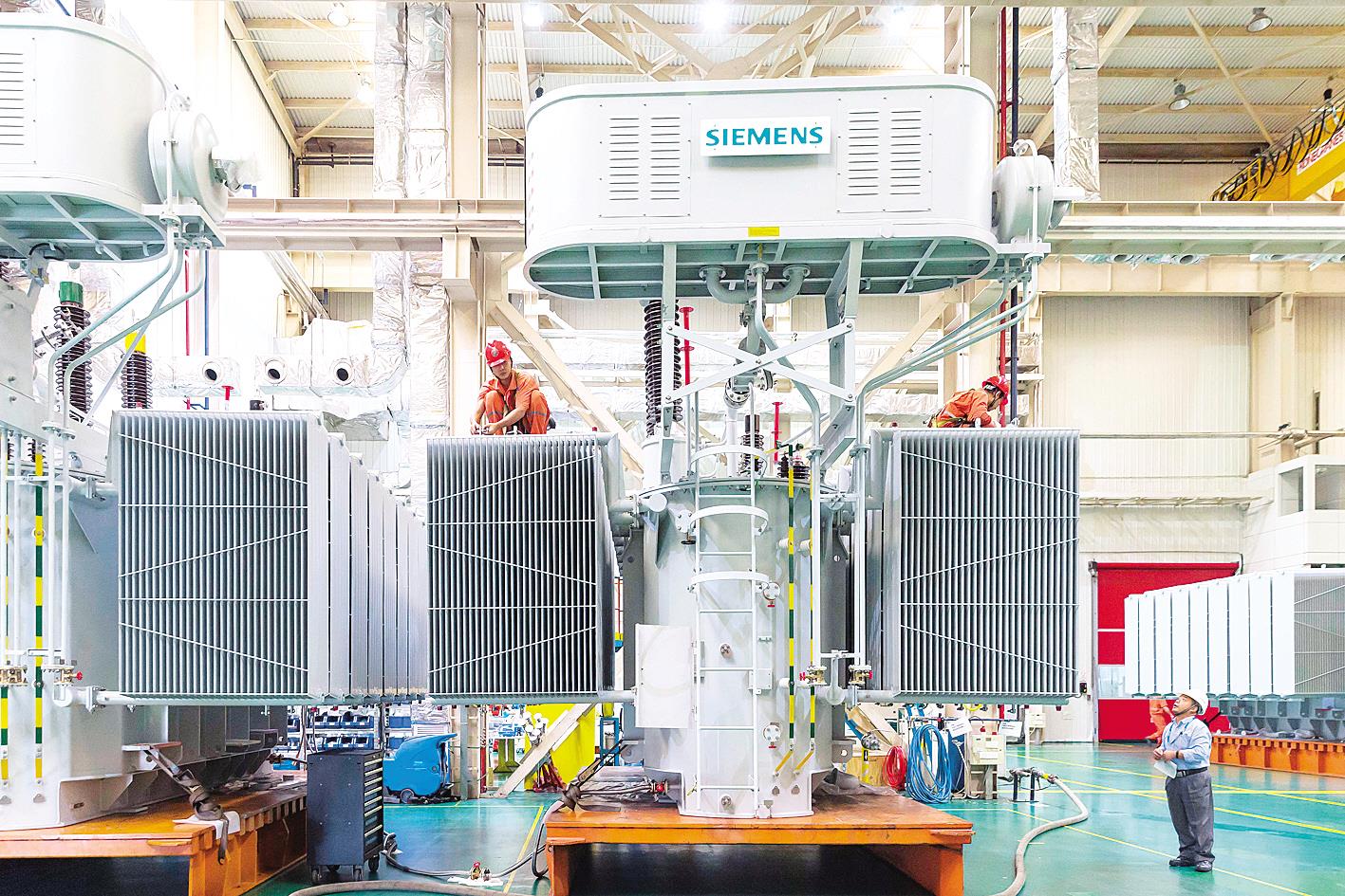 位于阳逻经济开发区的西门子变压器(武汉)有限公司,工作人员正在进行变压器总装生产。 (湖北日报全媒记者 梅涛 摄)
