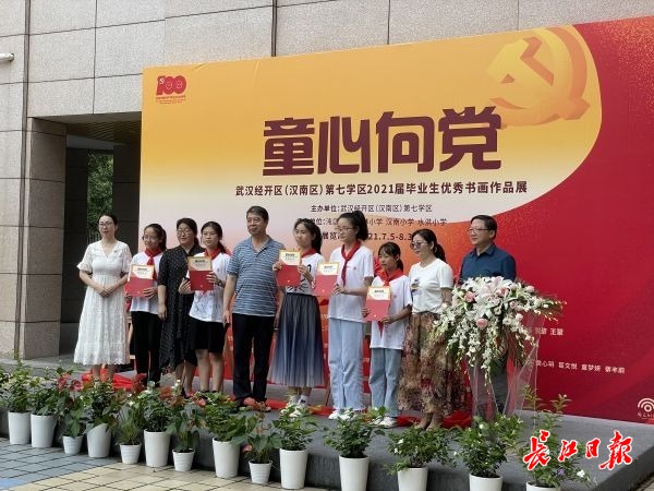 长江日报7月6日讯 7月5日,武汉经济技术开发区第七学区在同美术馆举办“童心向党·2021届毕业生优秀书画作品展”,来自沌口小学、子林小学、汉南小学、水洪小学四校毕业生的60余副书法作品被展出。