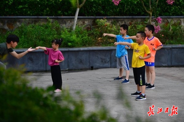 汉口范湖小森林里,大树浓荫下,几名小朋友在教练的带领下学习武术,出拳、下腰、空翻,练得满头大汗却又兴致勃勃。
